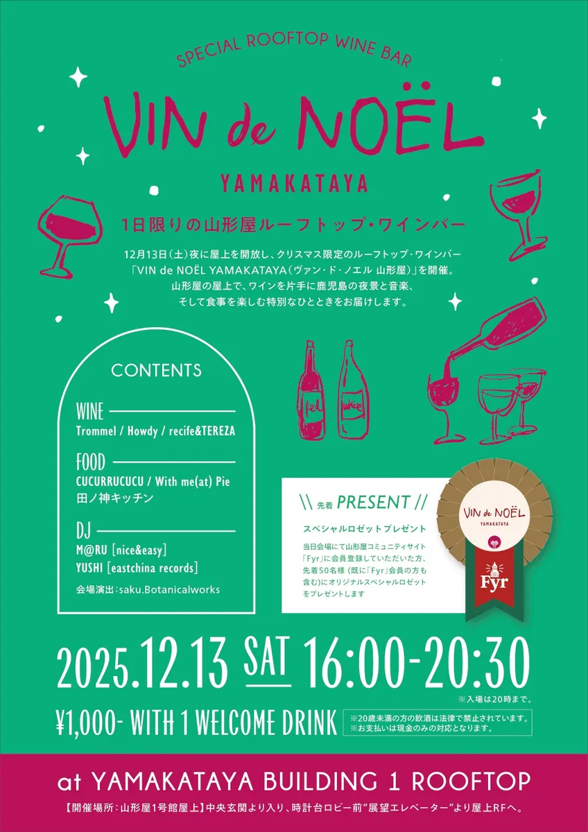 トップ > トピックス > 店内のイベント > 🎄一夜限りの屋上クリスマスワインバー🍷 Fyr 運営編集部 2025/12/05 19:01 🎄一夜限りの屋上クリスマスワインバー🍷 みなさんこんばんは! Fyr編集部から素敵なお知らせを… 12月13日(土) 山形屋1号館屋上にて初のイベント 山形屋 屋上クリスマスワインバー 「VIN de NOEL(ヴァン・ド・ノエル)」 の開催が決定しました!!👏✨ 山形屋の屋上で、ワインを片手に鹿児島の夜景と音楽、そして食事を楽しむ 魔法にかかるクリスマスのひとときをお届けします🎄 詳細は下記をご参照ください。 みなさまにお会いできるのを楽しみにしております!! 魔法にかかるクリスマス 山形屋のクリスマス いいね 共有する 共有する X facebook LINE リンクをコピー コメントする 1 件の返信 (新着順) ミュートしたユーザーの投稿です。 投稿を表示 Co.die 2025/12/13 22:15 生憎の☔️でしたが音楽と相まって幻想的な空間でした🎄 富士ロックのように伝説の第一回として語り継がれるかも⁉️🤭 いいね 返信する ミュートしたユーザーの投稿です。 投稿を表示 Fyr 運営編集部 2025/12/15 18:39 Co.die ご来場くださってたのですね!雨風の冷たい中本当にありがとうございました! 雨に反射する灯りもいいなと思いながら、私も会場を見ておりました。✨🎄 次回もよりパワーアップさせて春でも夏でも開催できたらいいなと考えておりますので 機会が合えばぜひまたのお越しをお待ちしております😊 いいね 返信する