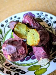 NEW 山形屋の焼きいも屋さん🍠 食欲の秋到来🍁✨️最近よく食べる🍠山形屋の焼きいも🍠お店の前を通ると誘惑の香りが🤣🤣1日約1300本を販売する人気店です⤴️さつまいも紅はるか🍠の熟成したねっとり甘い感じにはまっていて、柔らかいので皮まで全部食べちゃいます!お皿はお気にいりのフィンランド陶器ARABIA。葡萄柄🍇で秋になると出番が多